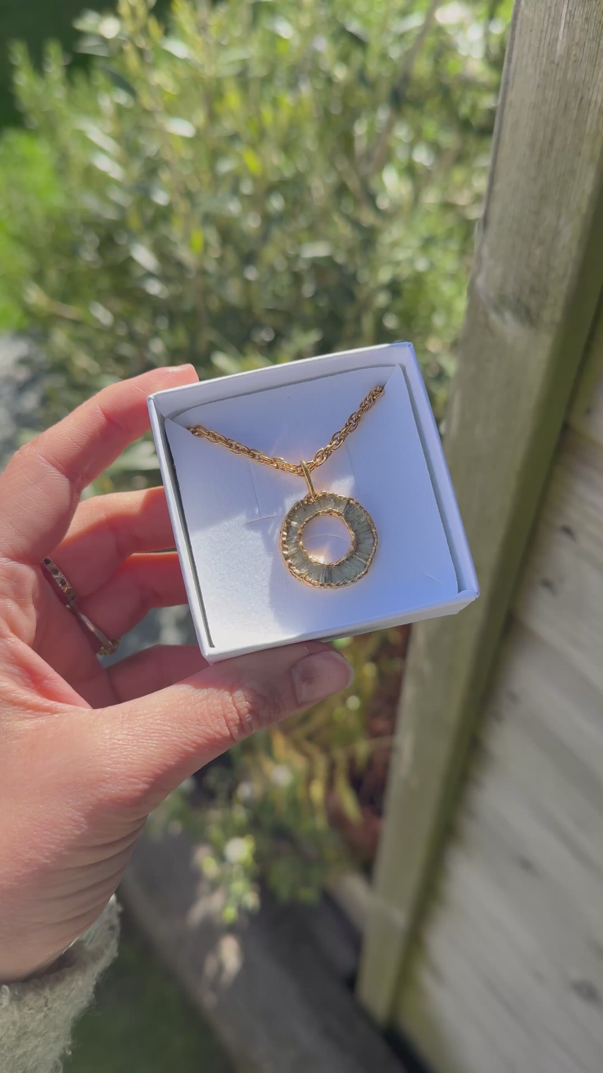 The bevelled metal echoes white water; the colour of kyanite brings the calm of the sea to your day. Each necklace is made to order, so the texture and stone are subtly unique.